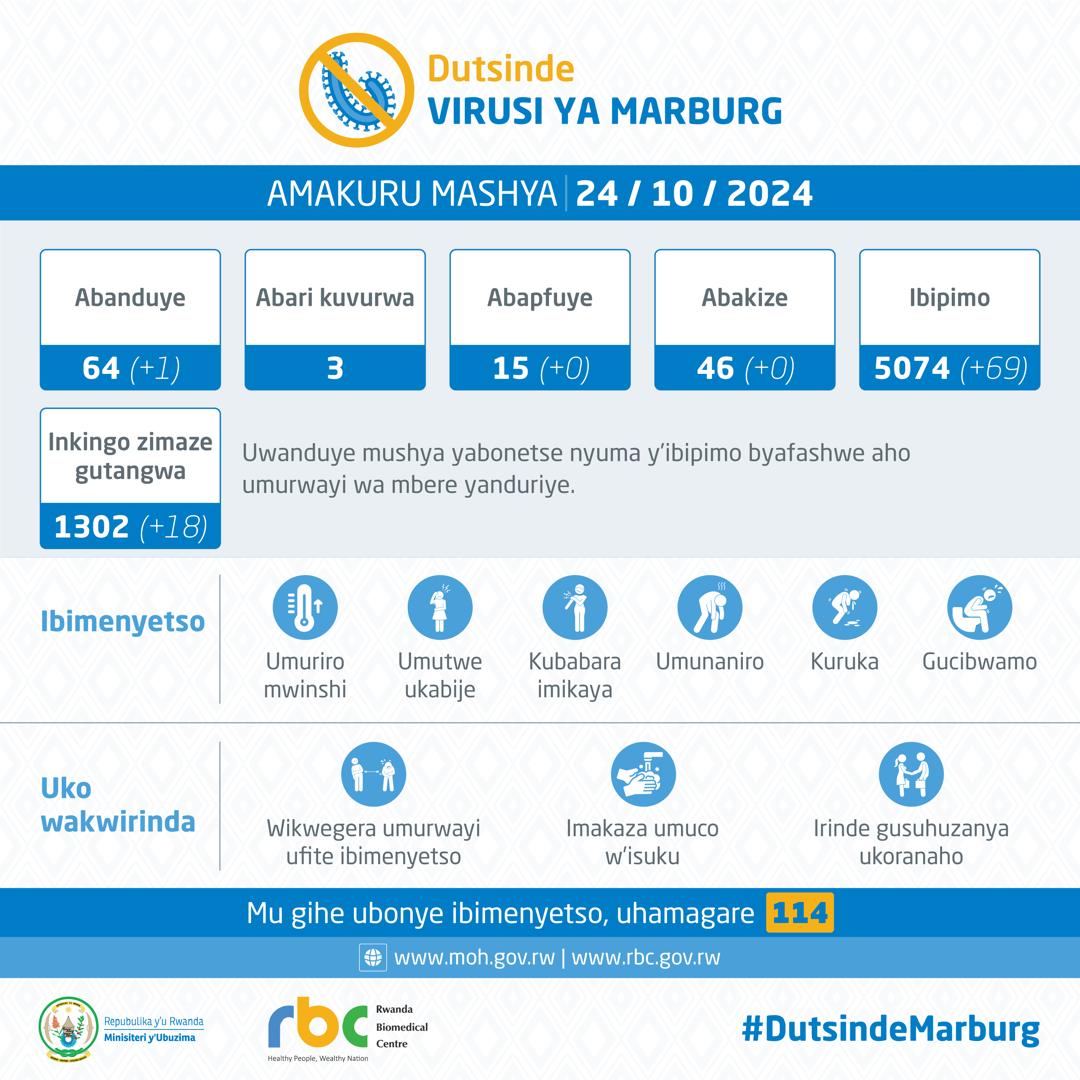 Minisiteri y’Ubuzima yatangaje ko ku wa Kane tariki 24 Ukwakira 2024 habonetse undi muntu umwe wanduye icyorezo cya Marburg, akaba yabonetse nyuma y’ibipimo byafashwe aho umurwayi wa mbere yanduriye.