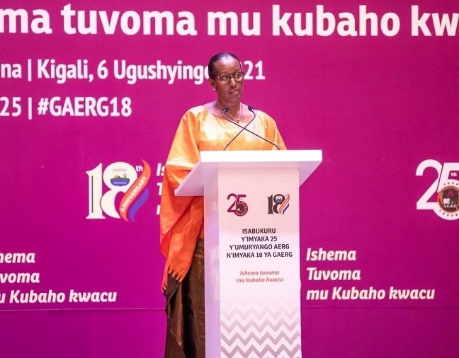 Madamu Jeannette Kagame, kuri uyu wa Gatandatu tariki 06 Ugushyingo 2021 yitabiriye ibirori byo kwizihiza isabukuru y’imyaka 25 ishize umuryango w’abanyeshuri barokotse Jenoside yakorewe Abatutsi (AERG) ubayeho, n’imyaka 18 ishize hashinzwe undi muryango witwa GAERG w’abahoze ari abanyeshuri barokotse Jenoside yakorewe (…)