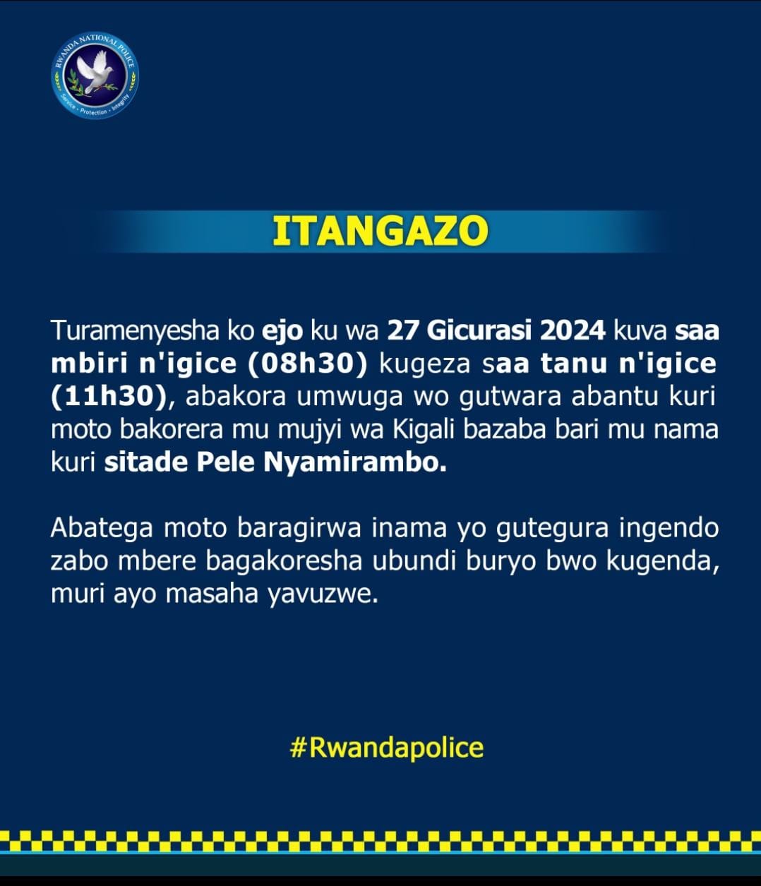 Iryo tangazo ryamenyeshaga abatega Moto ko bazihanganira impinduka kubera ayo masaha moto zari kumara zidakora. Byari biteganyijwe ko Abamotari bakorera mu Mujyi wa Kigali bazaba bari mu nama kuri Sitade yitiriwe Pelé iri i Nyamirambo.
