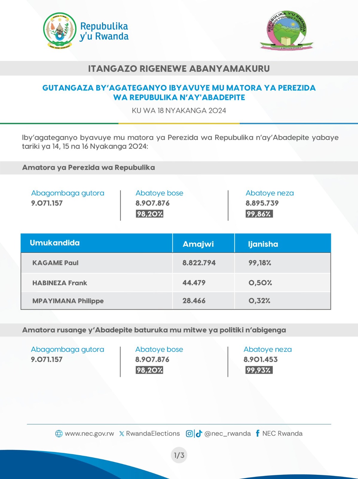 Kuri uyu wa Kane tariki 18 Nyakanga 2024, nibwo Komisiyo y’Amatora yatangaje amajwi y’agateganyo y’ibyavuye mu matora ya Perezida wa Repubulika n’ay’Abadepite mu byiciro byose.