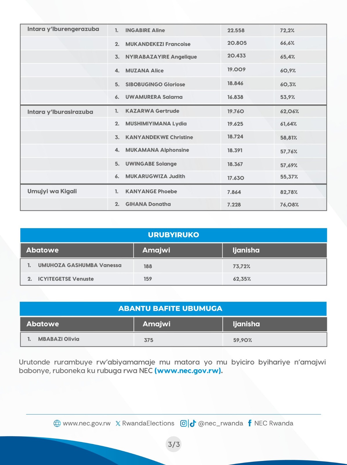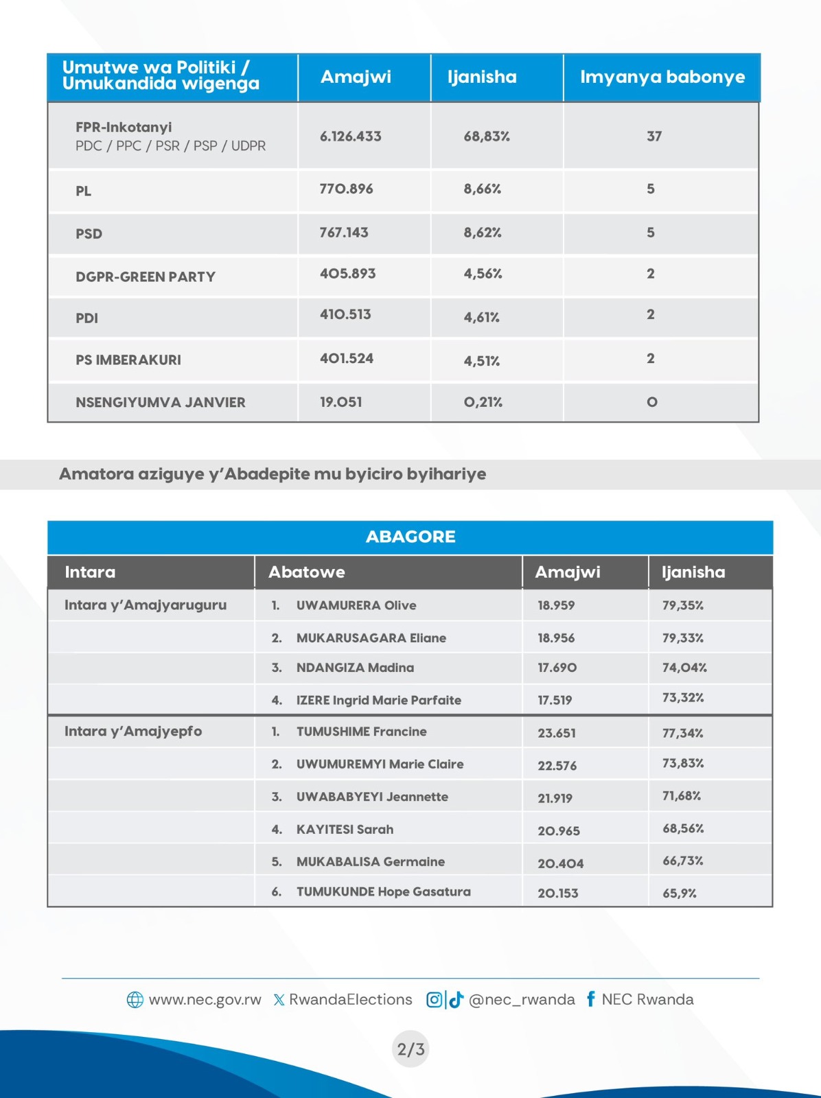 Mu Ntara y’Iburengerazuba: Abatowe ni Ingabire Aline watowe ku majwi 72.2%, Mukandekezi Francoise ku majwi 66.6%, Nyirabazayire Angelique ku majwi 65.4%, Muzana Alice ku majwi 60.9%, Sibobugingo Gloriose n’amajwi 60.3% ndetse na Uwamurera Salama watowe ku majwi 53.9%.