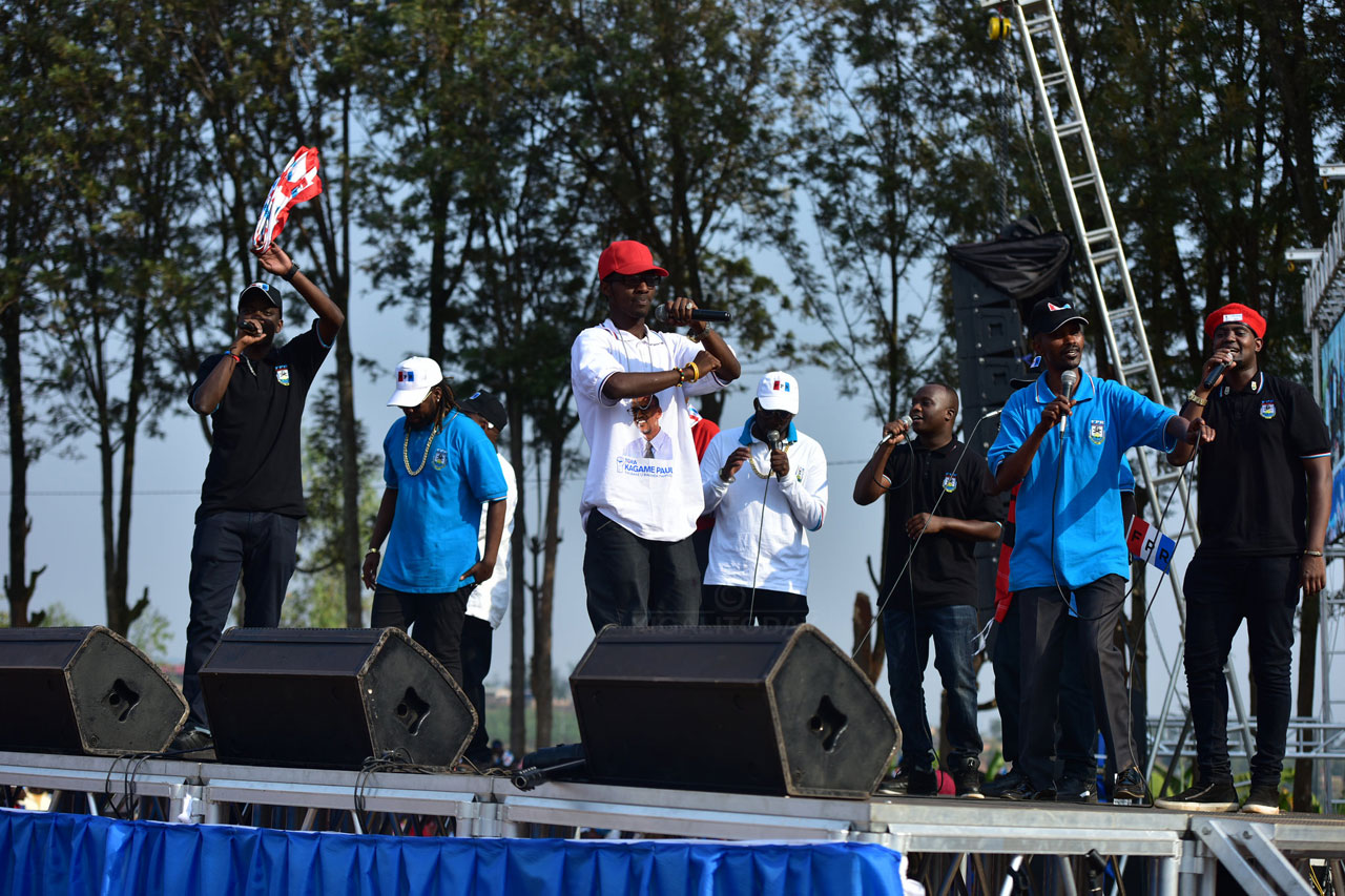 Aba bahanzi biyemeje guherekeza Paul Kagame aho aziyamamariza hose. Mbere yuko ageza ijambo ku bitabiriye uwo muhango, abo bahanzi babanza gususurutsa abaturage baririmba banabyina indirimbo zitandukanye zamamaza umukandida wa FPR-Inkotanyi.