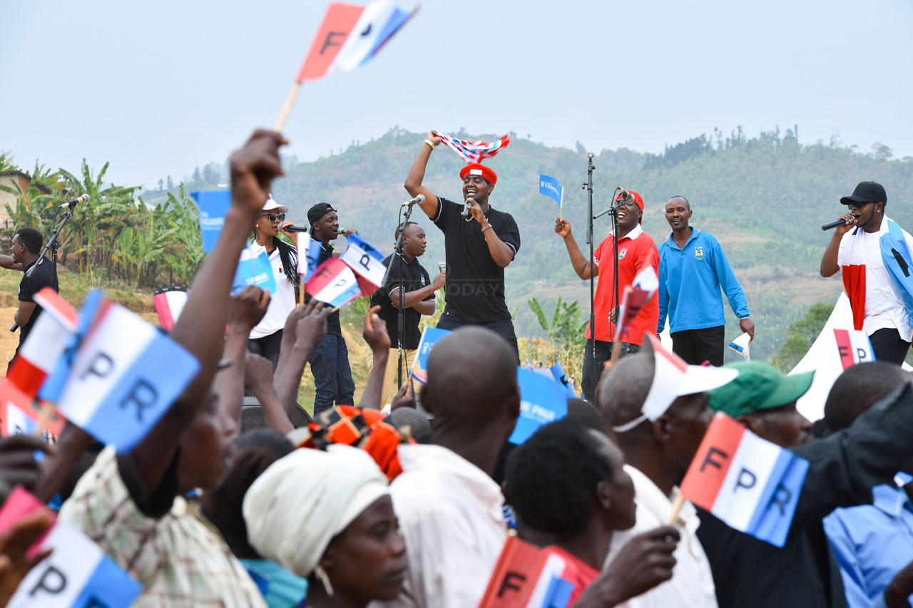 Aho Paul Kagame yiyamamariza hose, abo bahanzi baramuherekeza, mbere y’uko ageza ijambo ku bitabiriye uwo muhango bakabanza gususurutsa abaturage baririmba banabyina indirimbo zitandukanye zamamaza umukandida wa FPR-Inkotanyi.
