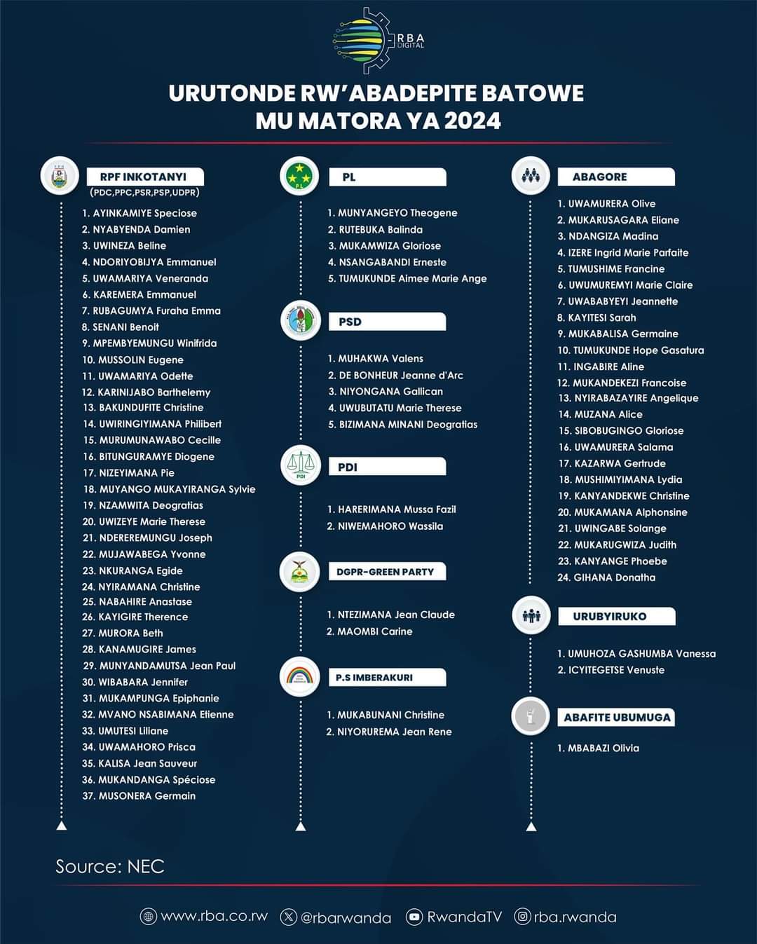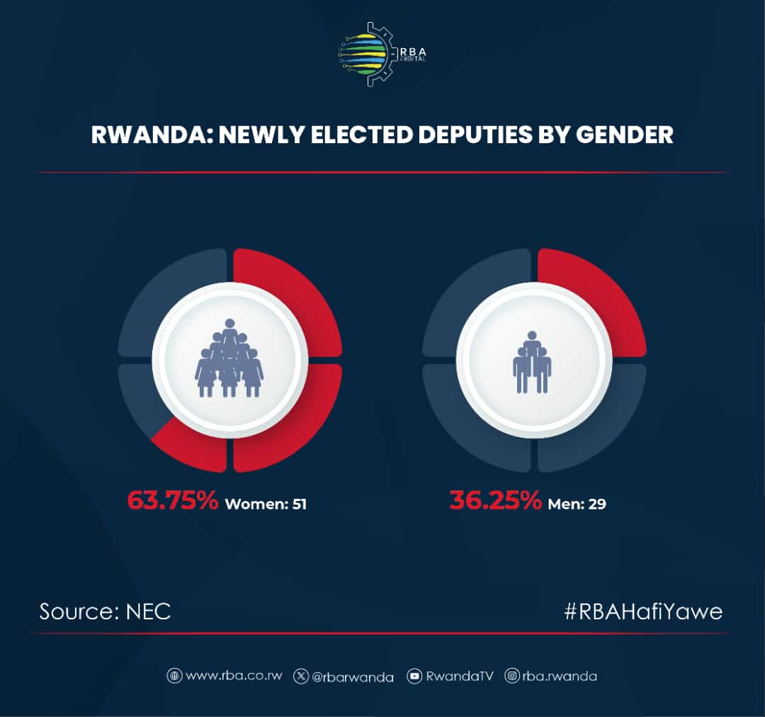 Ni nyuma y’uko muri manda ya 2018-2024 abagore mu Nteko ishinga Amategeko Umutwe w’Abadepite bari 61% ku bagabo 39%, ariko nk’uko bigaragara mu rutonde rw’abaherutse gutorwa rwashyizwe ahagaragara na NEC, muri manda ya 2024-2029 biragaragara ko umubare w’abagore wazamutse ujya kuri 63,75% mu gihe abagabo ari 36,25%.