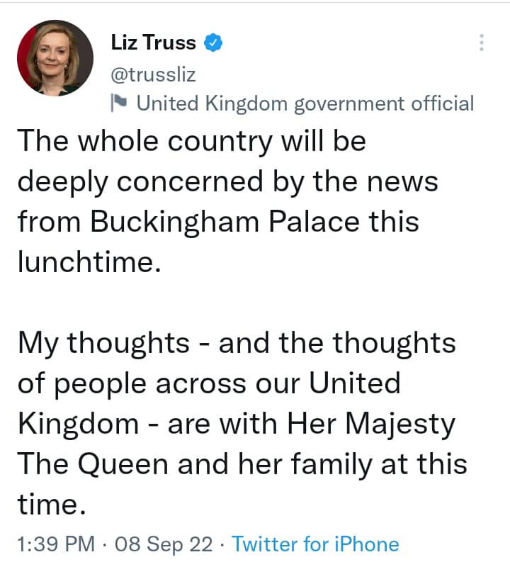 Ku rukuta rwa Twitter, Liz Truss na we yahise yandikaho ko igihugu cyose gihagaritswe umutima n’amakuru aturuka muri ’Buckingham Palace’, guhera ku manywa yo kuri uyu wa Kane tariki 08 Nzeri 2022.