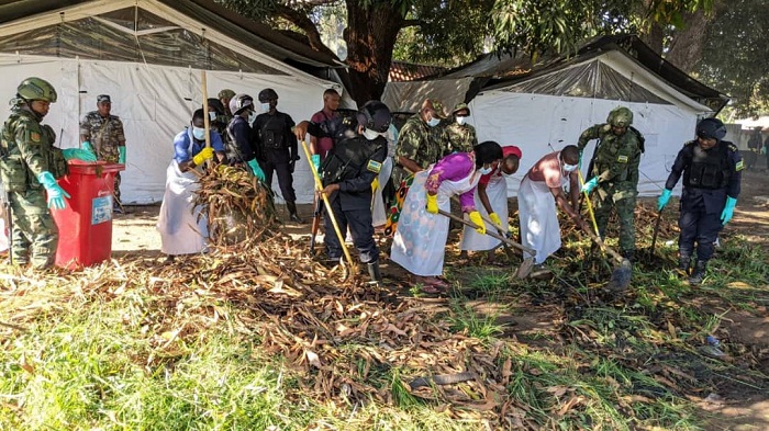 Inzego z’umutekano z’u Rwanda ndetse n’Ingabo za Mozambique, mu mujyi wa Palma zakoze ibikorwa by’isuku hafi y’ikigo nderabuzima cya Palma, bafatanyije n’abakozi bo kuri icyo kigo nderabuzima.