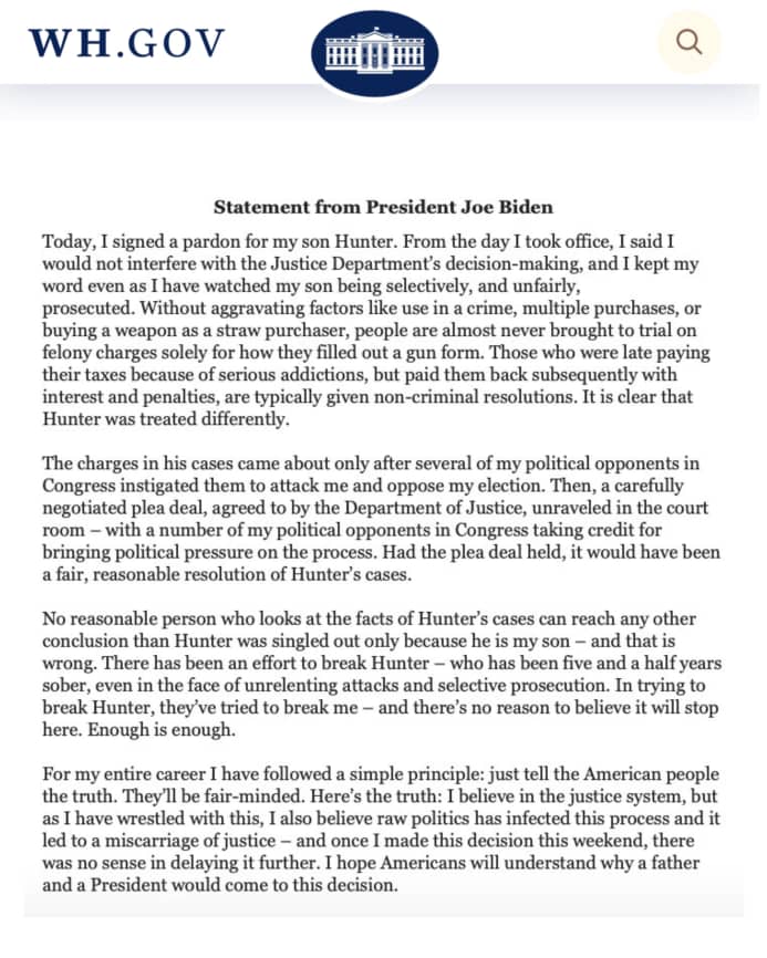 Yagize ati “Ntewe ishema cyane n’umuhungu wanjye, Hunter. Yatsinze ububata. Ni umwe mu bantu nzi bafite indangagaciro. Nubaha ibyemezo by’ubucamanza, nzabikora kandi ntabwo nzamuha imbabazi.”
