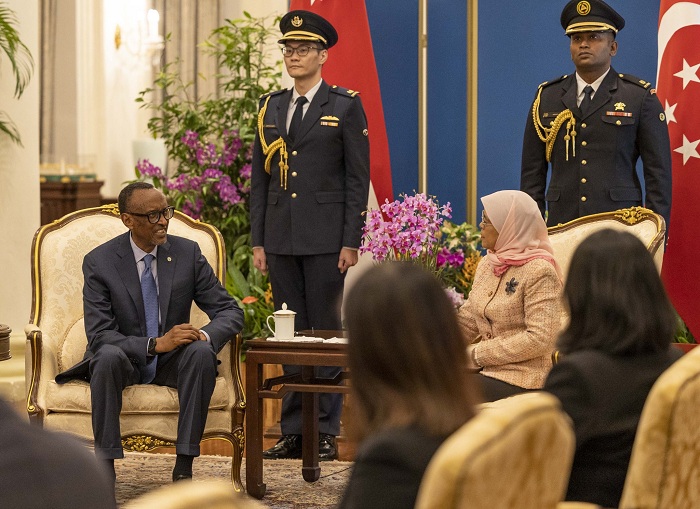 Perezida Kagame yakiriwe na Perezida wa Singapore Madame Halima Yacob mu ngoro ya perezidansi y’icyo gihugu, The Istana. Ibiganiro bagiranye byibanze ku mubano w’ibihugu byombi n’izindi ngingo z’ingirakamaro ku bihugu byombi zirimo guhanga udushya, ikoranabuhanga ndetse n’uburezi.