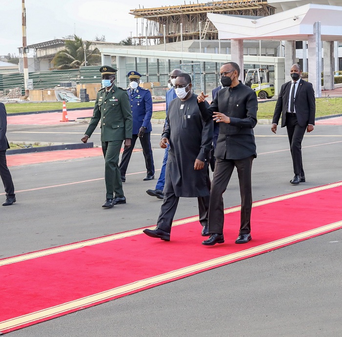 Ibiro by’Umukuru w’Igihugu cy’u Rwanda, byatangaje ko Perezida Kagame akigera ku Kibuga cy’indege yakiriwe na mugenzi we wa Sénégal, Macky Sall. Abo bayobozi kandi bagiranye ibiganiro byibanze ku mubano w’ibihugu byombi.