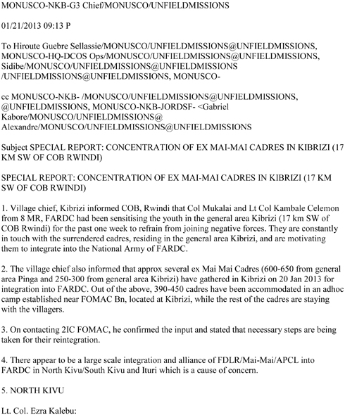 Ibaruwa MONUSCO yandikiye ushinzwe kugarura amahoro muri Congo, Hiroute Guebre Sellassie, taliki 21/01/2013 ivuga ko Gen. Masunzu uyobora ingabo za FARDC muri Kivu y’Amajyepfo ari kongerera ibikoresho umutwe wa FDLR no kuwushyira mu duce twegereye umujyi wa Goma.