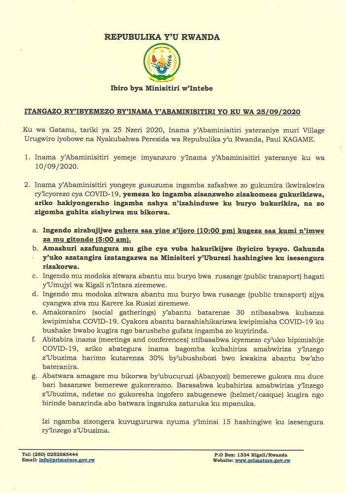 Inama y’Abaminisitiri yateraniye muri Village Urugwiro iyobowe na Nyakubahwa Perezida wa Repubulika y’u Rwanda, Paul Kagame, ku wa Gatanu tariki ya 25 Nzeri 2020, yafatiwemo ibyemezo bikurikira: