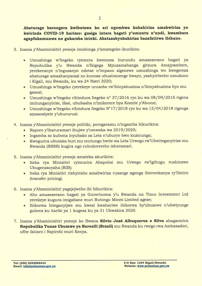 5. Inama y’Abaminisitiri yemeje amateka akurikira: