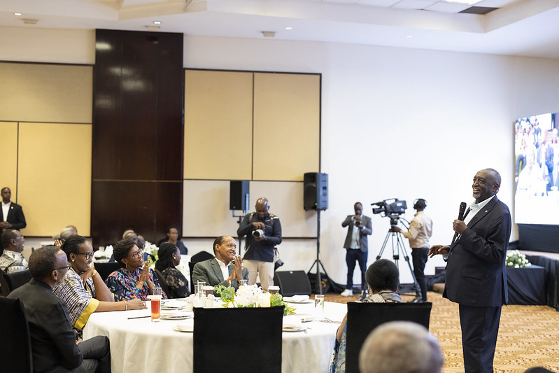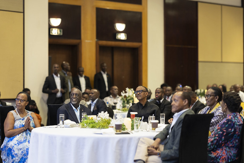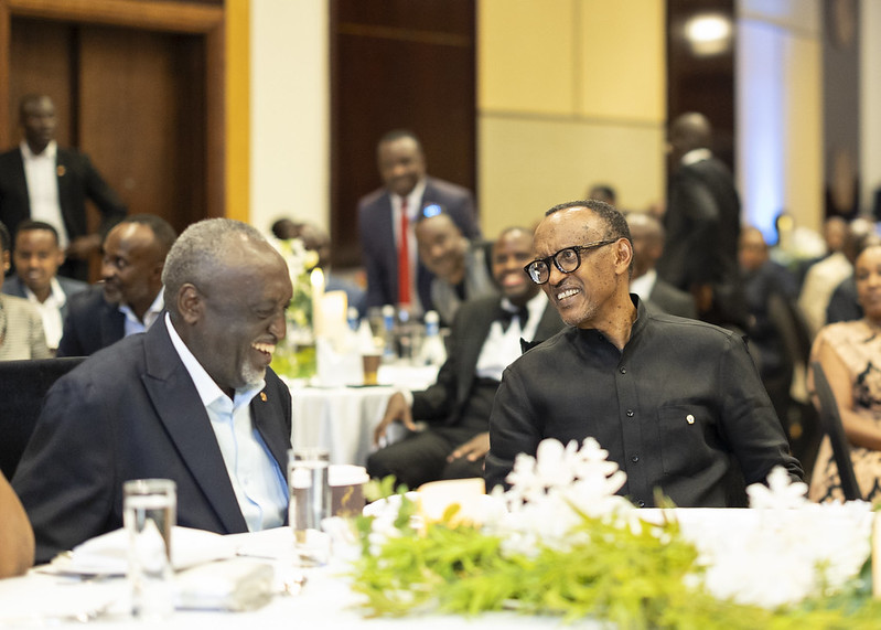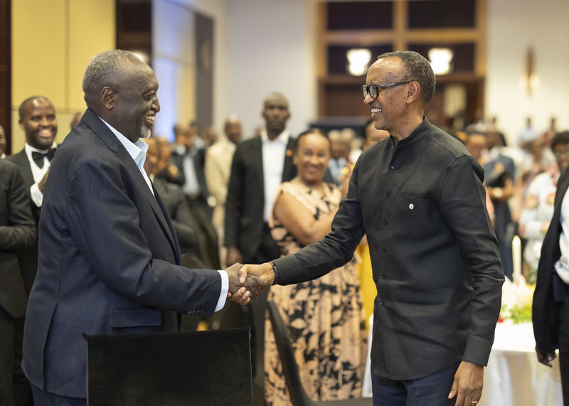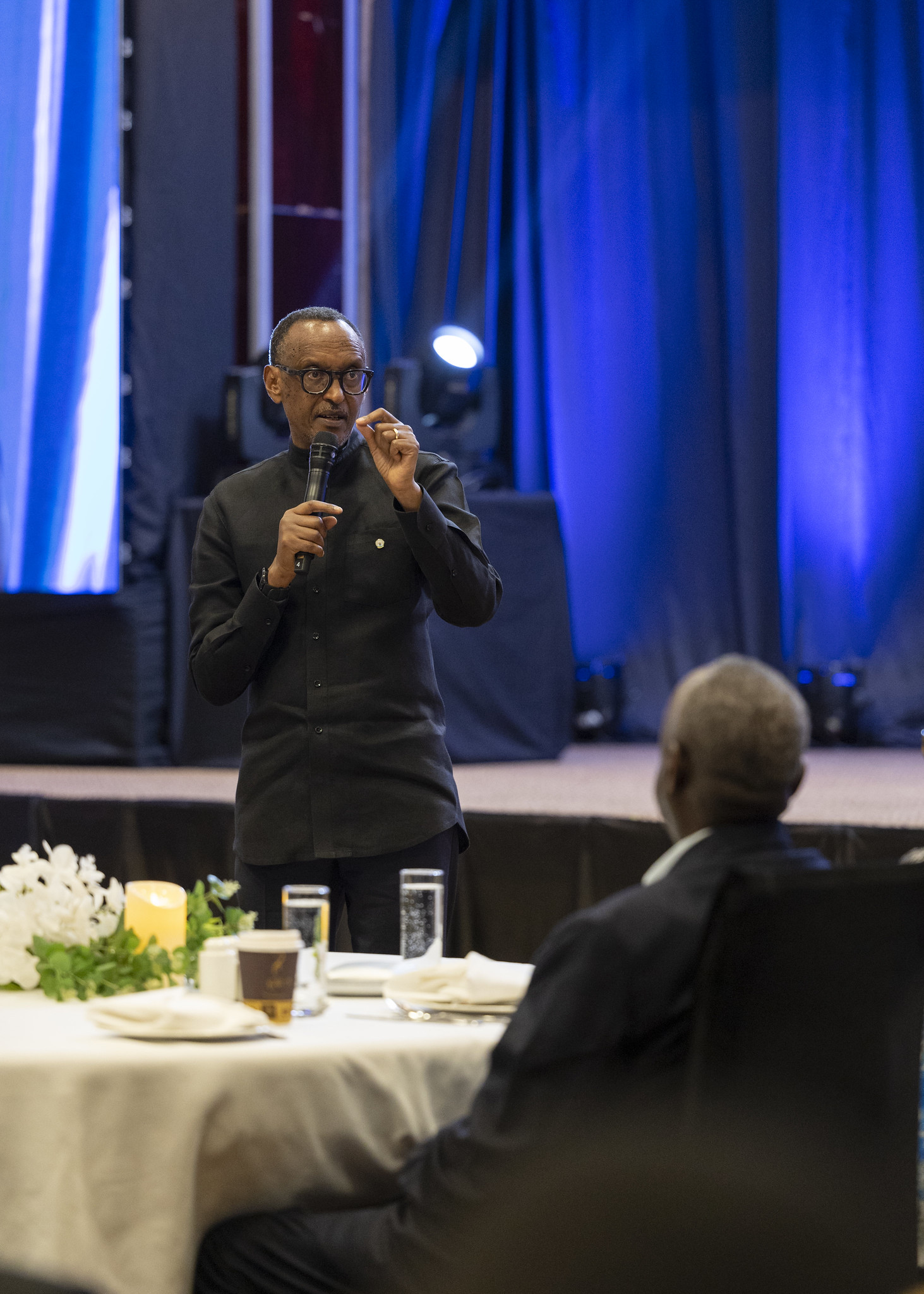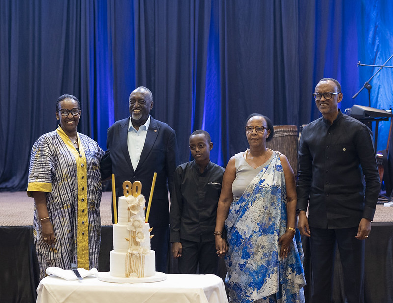 Perezida Paul Kagame na Madamu Jeannette Kagame, ku mugoroba wo ku wa Gatandatu tariki 23 Ugushyingo 2024, bifatanyije na Hon. Tito Rutaremara n’abo mu muryango we, kwizihiza isabukuru y’imyaka 80 amaze avutse.