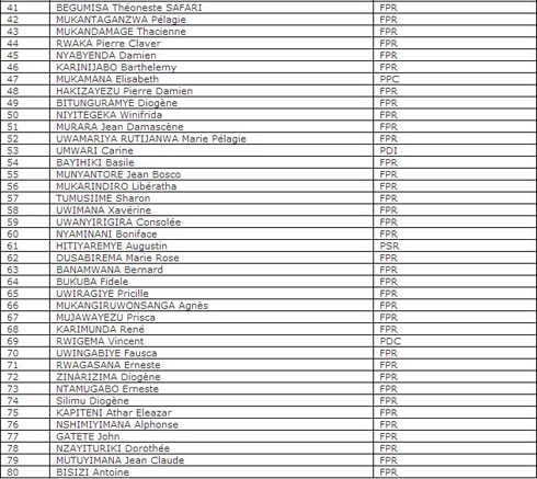 1.Umuryango FPR- INKOTANYI n’indi mitwe ya politiki yifatanije nayo (PDC, PDI, PSR, PPC,) watanze urutonde rugizwe n’abakandida 80. Abakandida bemejwe by’agateganyo ni 80, aribo aba bakurikira :