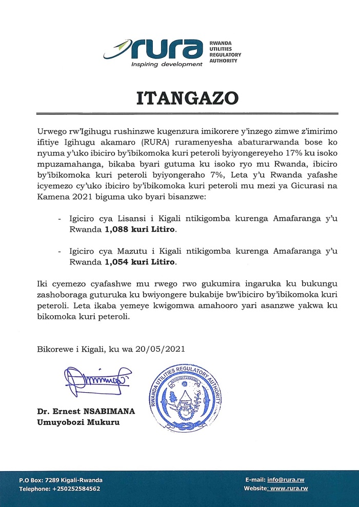 Urwego Ngenzuramikorere (RURA) rwatangaje ko n’ubwo ibiciro by’ibikomoka kuri peteroli byiyongereyeho 17% ku isoko mpuzamahanga, Leta y’u Rwanda yafashe icyemezo cy’uko ibiciro muri Gicurasi na Kamena 2021 biguma uko byari bisanzwe, nk’uko biri muri iri tangazo.