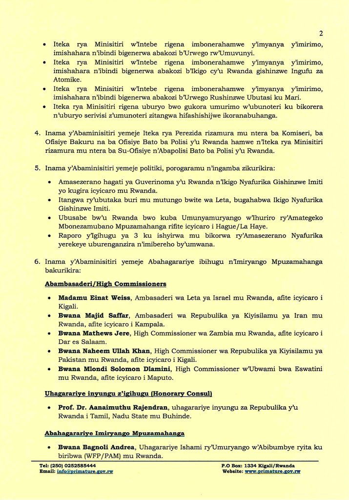 Mbere twumvaga ibyemezo by’inama y’abaminisitiri tugahita tugira amatsiko yabahawe imyanya, Rwose bishobotse turasaba ubuyobozi kwiga neza kuri iyi ngingo, hakajya hatangazwa abashya bahawe imirimo mu inana y’abaminisitiri, naho usanzwe ukarimo ntampamvu yo kumwemeza nkuko Itegeko nshinga ryavuguruwe, ABANTU BAHYASHYA BAHAWE IMIRIMO BAKAJYA BATANGAZWA MU IMANA Y’ABAMINISITIRI, Murakoze kumva ibitekerezo byacu