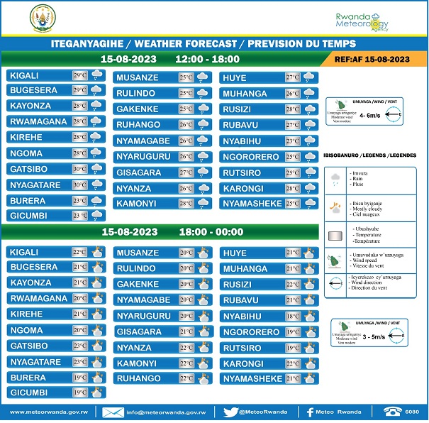 Ikigo gishinzwe Ubumenyi bw’Ikirere Meteo-Rwanda, cyari cyatangaje ko ku gicamunsi cyo kuri uyu wa Kabiri tariki ya 15 Kanama 2023 hagati ya saa sita(12:00) na saa kumi n’ebyiri z’umugoroba (18:00) hateganyijwe imvura mu turere twose tw’Igihugu.