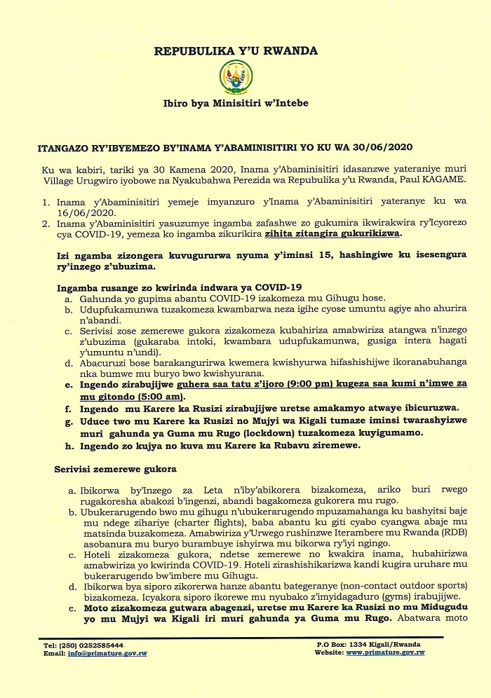 Ku wa Kabiri tariki ya 30 Kamena 2020, Inama y’Abaminisitiri idasanzwe yateraniye muri Village Urugwiro iyobowe na Nyakubahwa Perezida wa Repubulika y’u Rwanda, Paul Kagame, ifatirwamo imyanzuro ikurikira: