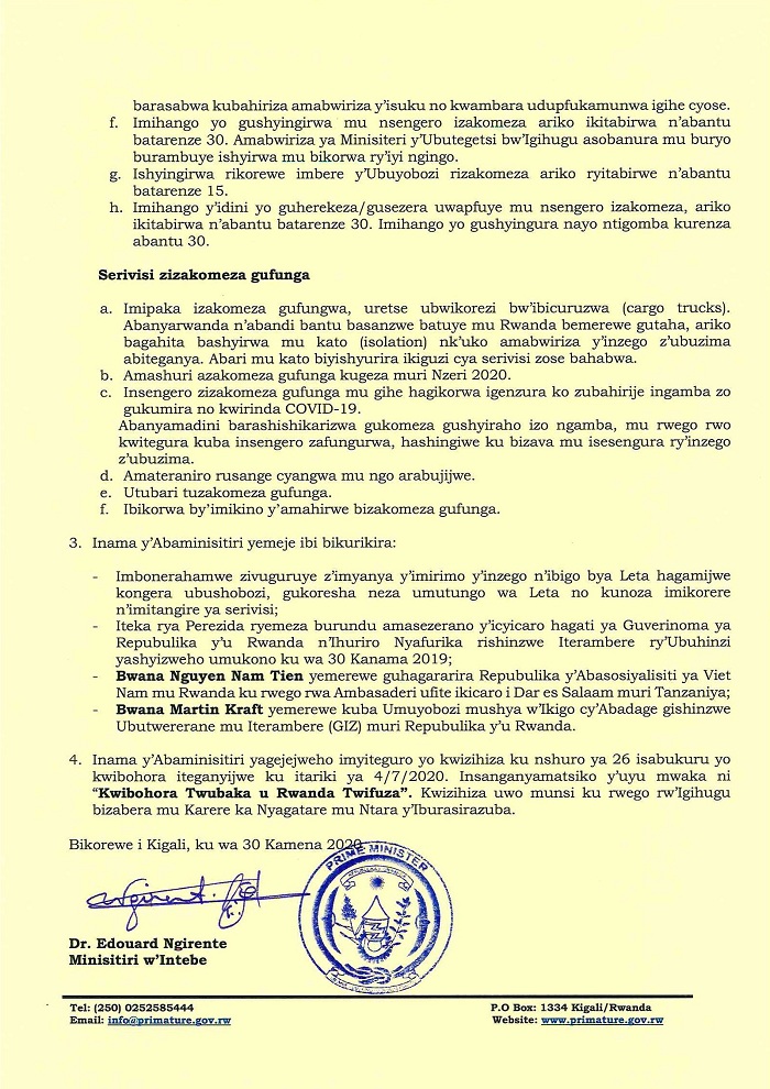 a. Imipaka izakomeza gufungwa, uretse ubwikorezi bw’ibicuruzwa (cargo trucks). Abanyarwanda n’abandi bantu basanzwe batuye mu Rwanda bemerewe gutaha, ariko bagahita bashyirwa mu kato (isolation) nk’uko amabwiriza y’inzego z’ubuzima abiteganya. Abari mu kato biyishyurira ikiguzi cya serivisi zose bahabwa.