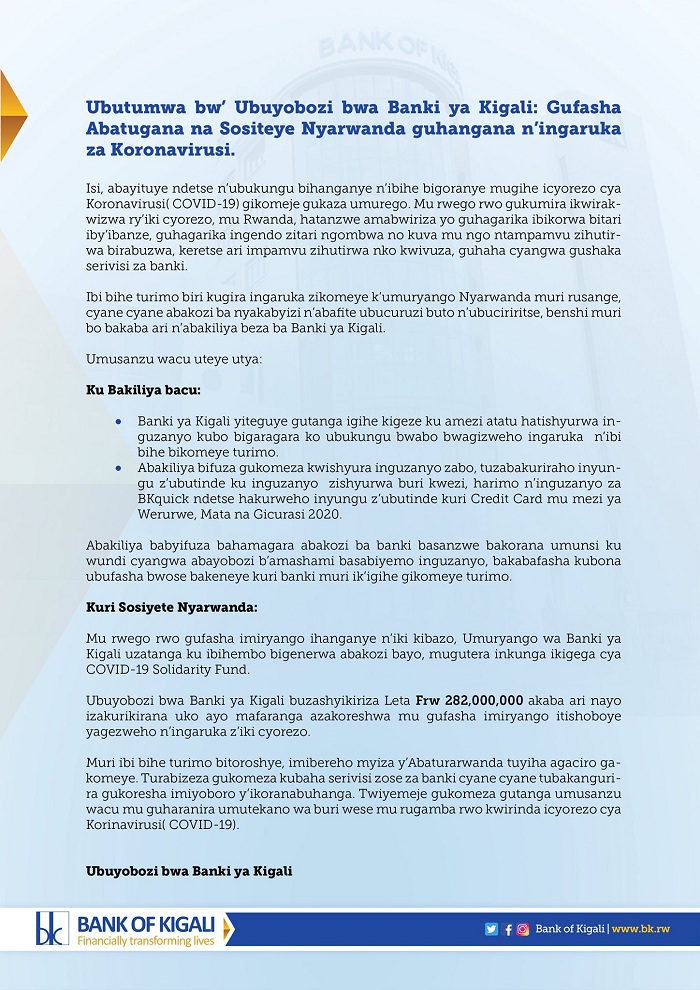 Banki ya Kigali kandi ivuga ko muri ibi bihe bitoroshe, iha agaciro gakomeye imibereho y’Abaturarwanda, ikabizeza gukomeza kubaha serivisi zose za Banki, cyane cyane ibakangurira gukomeza gukoresha imiyoboro y’ikoranabuhanga.