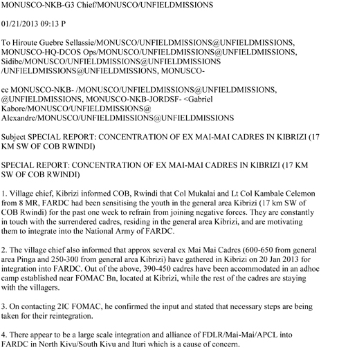 Iyi baruwa yanditswe na Lt Col Rajeev Sharma umuyobozi mu ngabo za MONUSCO muri Kivu y’amajyaruguru ayandikira madame Hiroute Guebre Sellassie, Gabriel Kabore n’abandi bayobozi muri MONUSCO ivuga ko batayo ya FDLR iyobowe na Lt. Col. Ezra Kalebu yagiye gukorera ahitwa Kishishi, Kibirizi, Bambo, Mubambiro, Sake, Kiroche, Ishasha na Minova kandi yahawe ibikoresho bigizwemo uruhare ne Gen Masunzu uyobora FARDC muri Kivu y’Amajyepfo.