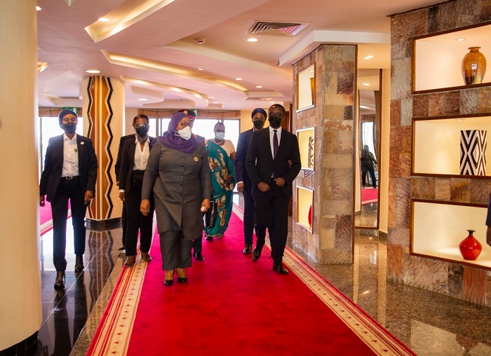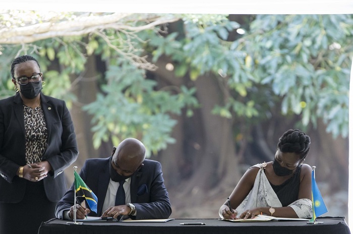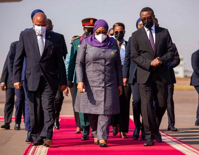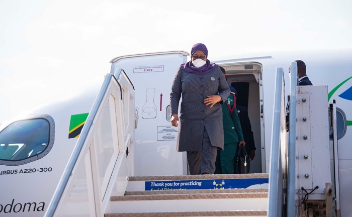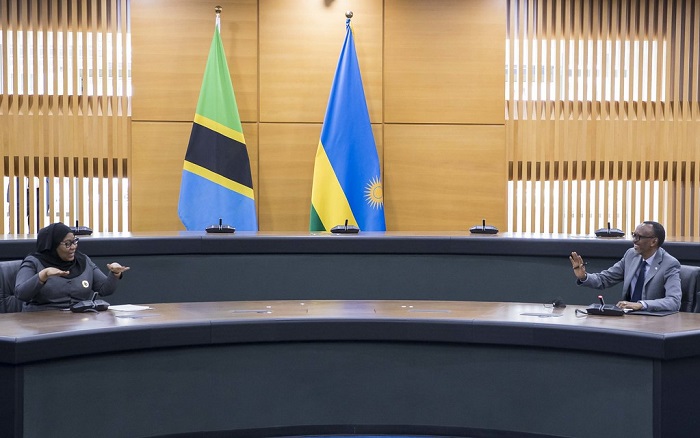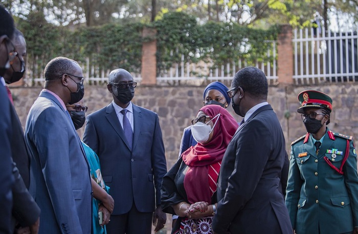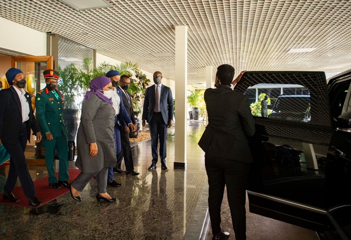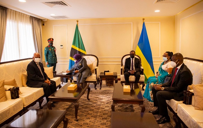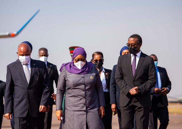 Akigera ku kibuga cy’indege i Kanombe, Perezida Suluhu yakiriwe na Minisitiri w’Ububanyi n’Amahanga w’u Rwanda, Dr Vincent Biruta. Yakiriwe kandi na Perezida Kagame bagirana ibiganiro, ndetse bayobora isinywa ry’amasezerano atandukanye hagati y’ibihugu byombi.