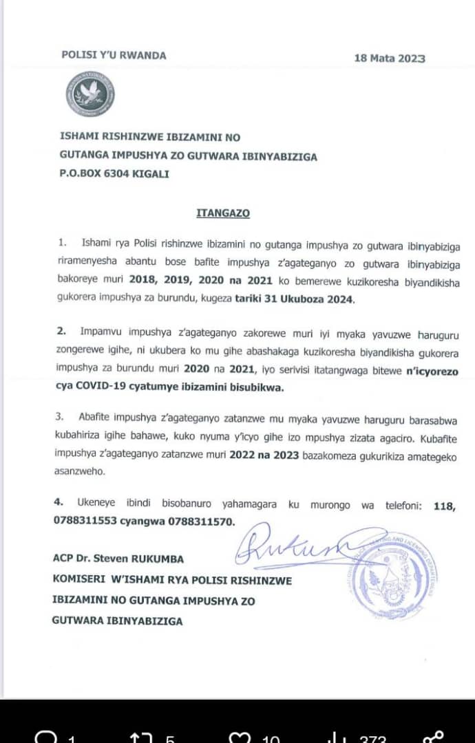 Polisi y’u Rwanda, Ishami rishinzwe Ibizamini no gutanga Impushya zo gutwara ibinyabiziga, ryemereye abafite impushya z’agateganyo (provisoire), zatanzwe mu myaka ya 2018-2021, kuzikoresha bitarenze tariki ya 31 Ukuboza 2024.