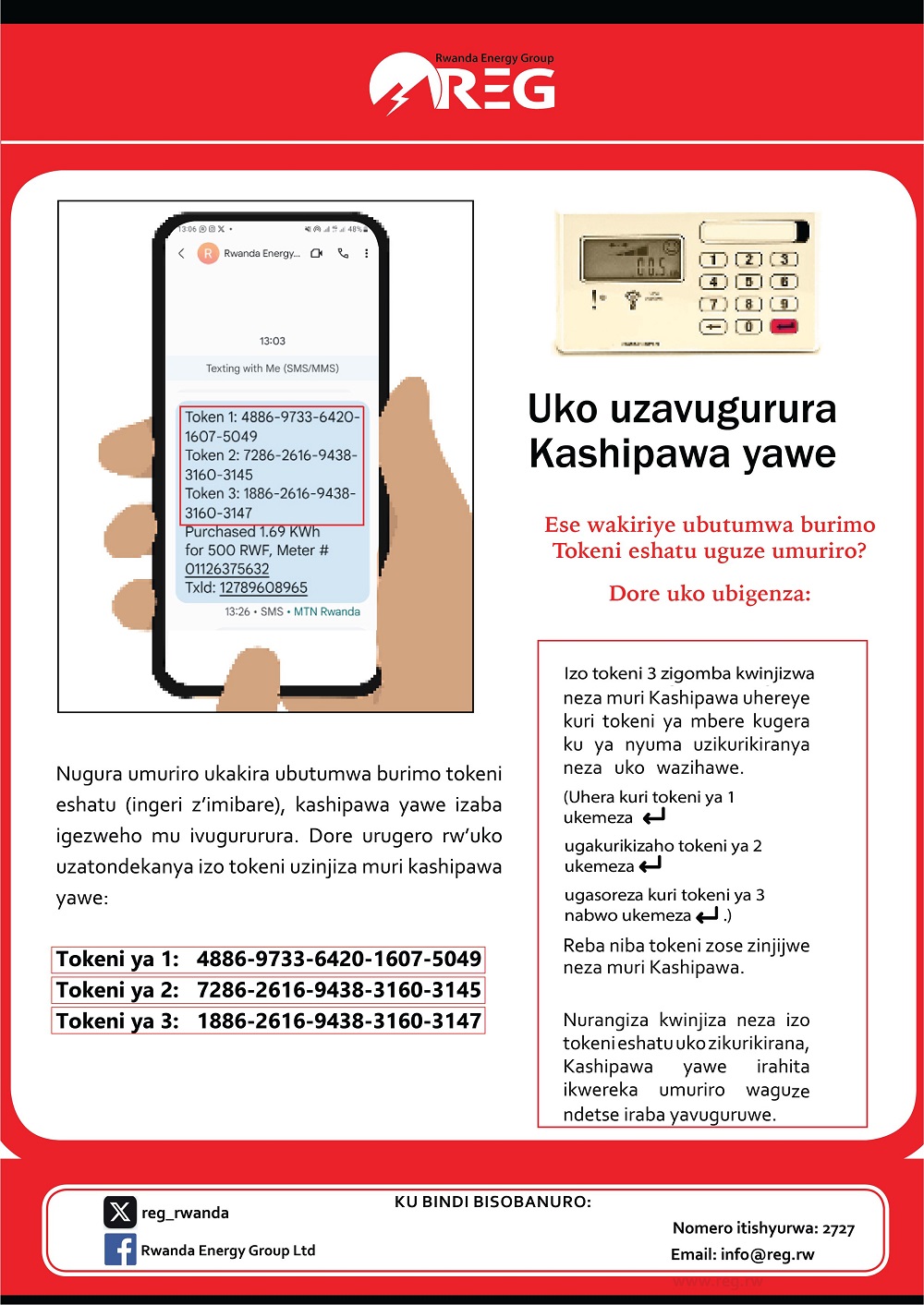 REG iti “Iyo tariki izagera mubazi dufite mu gihugu zose zaramaze kuvugururwa zarashyizwe mu ikoranabuhanga rishya ryemewe n’abarikoze. Nugerwaho uzagura umuriro ubone tokeni eshatu uzibone mu butumwa bwa telefone niba ugura umuriro ukoresheje telefone. Tokeni ni ya mibare 20 umuntu bamuha iyo aguze umuriro. Buri tokeni numara kuyishyiramo uzajya wemeza. Numara kuzishyiramo zose uko ari eshatu, icyo gihe mubazi yawe izaba imaze kuvugururwa, ndetse n’umuriro waguze uzahita ujyamo. Ibyo bikorwa rimwe, ku zindi nshuro uzajya ugura umuriro ubone tokeni imwe uyishyiremo bibe birahagije.”