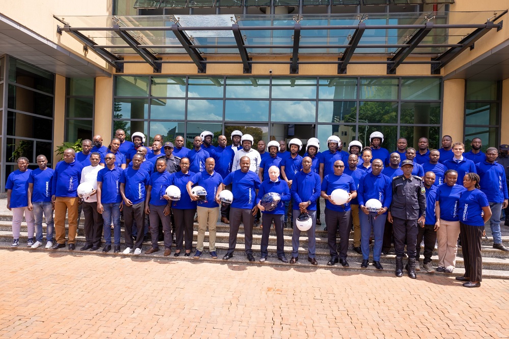 Minisitiri w’Ibikorwa Remezo, Dr Jimmy Gasore, ari kumwe n’Intumwa yihariye y’Umunyamabanga Mukuru wa UN, Jean Henri Todt, batanze kasike 500 zivugwaho kuba zujuje ubuziranenge kurusha izisanzwe zikoreshwa n’abamotari.
