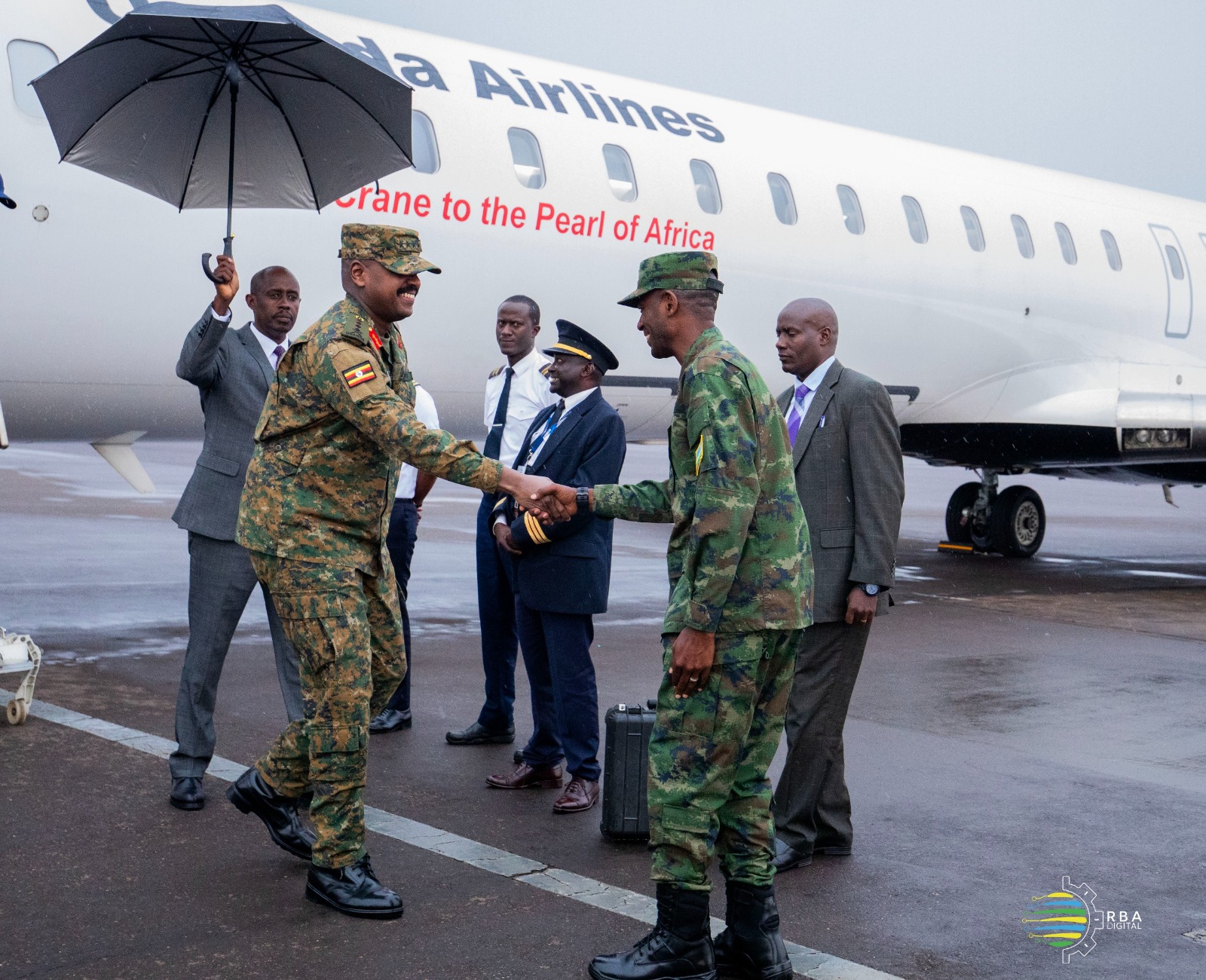 Akigera ku ku Kibuga cy’Indege Mpuzamahanga cya Kigali, General Muhoozi Kainerugaba yakiriwe n’Umugaba Mukuru w’Ingabo z’u Rwanda, Gen Mubarakh Muganga.