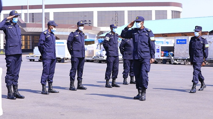 Abo bapolisi bose ku kibuga cy’indege mpuzamahanga cya Kigali baherekejwe banakirwa na bamwe mu bofisiye bakuru muri Polisi y’u Rwanda bari bayobowe na CP Bruce Munyambo.
