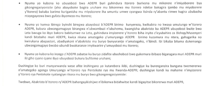 Ibyo Bishop wacu avuga ni ukuri, ntabwo waba warazahaye ngo ugere ku gikorwa nka kiriya cya Dove Hotel. Ese ubundi ayo mabaruwa 700 bayakiriye nka bande? abayabandikiye se bo bababwiwe n’iki? abo bantu ahubwo bafite ubugambanyi bukomeye n’ igihugu bakigambanira, ahubwo bakurikiranwe. Izo nama bakora za rwihishwa zigenzurwe kuko sibyo gusa ubwo bafite n’indi migambi mibisha. Itorero rya ADEPR rigeze heza ku bikorwa by’indashyikirwa kandi ryigejejeho ridategereje inkunga z’amahanga, urugero nko gufungura ururembo rw’i Burayi na Uganda, gufungura radio na television. Turasaba ubuyobozi bwacu gukurikirana iby’aka gatsiko batajenjetse. Abayobozi bacu turabashyigikiye mu kubaka itorero n’igihugu.