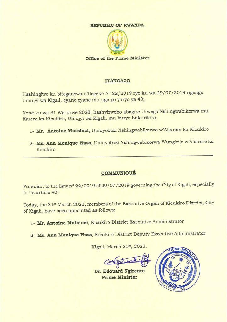 Itangazo ryaturutse mu Biro bya Minisitiri w’Intebe riravuga ko bwana Antoine Mutsinzi yagizwe Umuyobozi Nshingwabikorwa w’Akarere ka Kicukiro, naho Madamu Ann Monique Huss agirwa Umuyobozi Nshingwabikorwa Wungirije w’ako Karere.