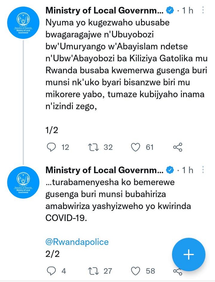 MINALOC yifashishije urubuga rwayo rwa Twitter, itangaza ko nyuma yo kugezwaho ubusabe bw’Ubuyobozi bw’Umuryango w’Abayisilamu ndetse n’Ubw’Abayobozi ba Kiliziya Gatolika mu Rwanda, busaba kwemererwa gusenga buri munsi nk’uko byari bisanzwe mu mikorere yabo, iyo Minisiteri yabigiyeho inama n’izindi nzego, hafatwa umwanzuro w’uko bemerewe gusenga buri munsi, bubahiriza amabwiriza yashyizweho yo kwirinda Covid-19.