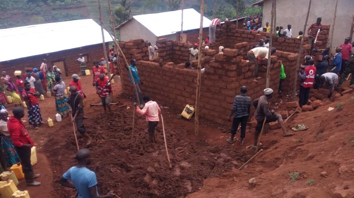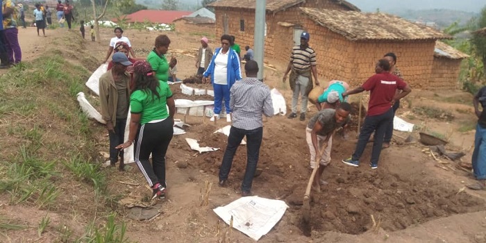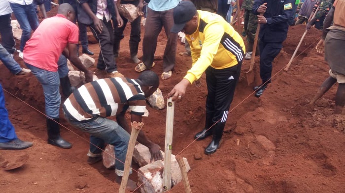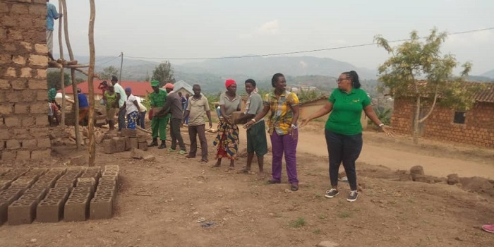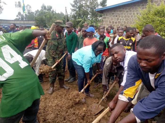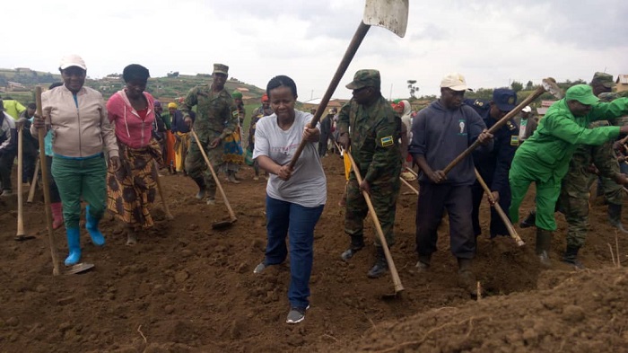 Minisitiri w’ibikorwa by’ubutabazi Kamayirese Germaine, yifatanyije n’abanyarutsiro mu gikorwa cy’umuganda ngarukakwezi. Hashijwe ibibanza bine mu rugamba rwo kubonera amacumbi abatishoboye.