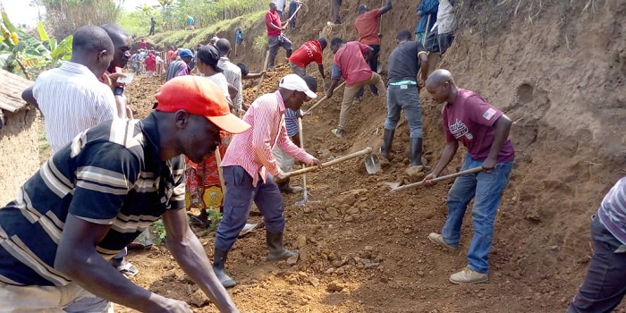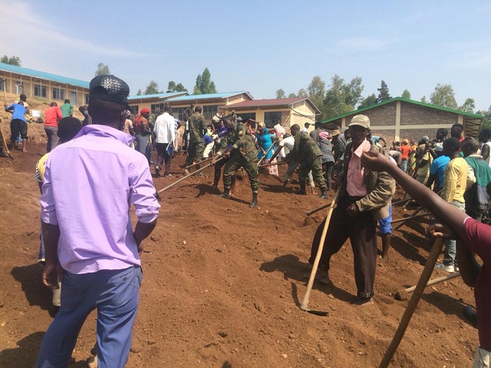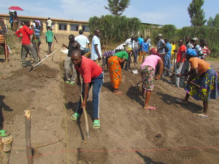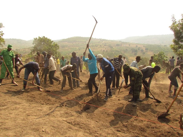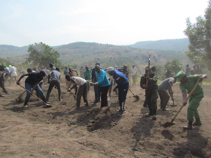 Abaturage bitabiriye umuganda bifatanyije n’Ubuyobozi mu gikorwa cyo gusiza ikibanza cy’ahagiye kuzubakwa ibyumba by’amashuri 8 n’ubwiherero 6 ku ishuri ribanza rya Gatoki riri mu mudugudu wa Karambi, Umurenge wa Busengo.