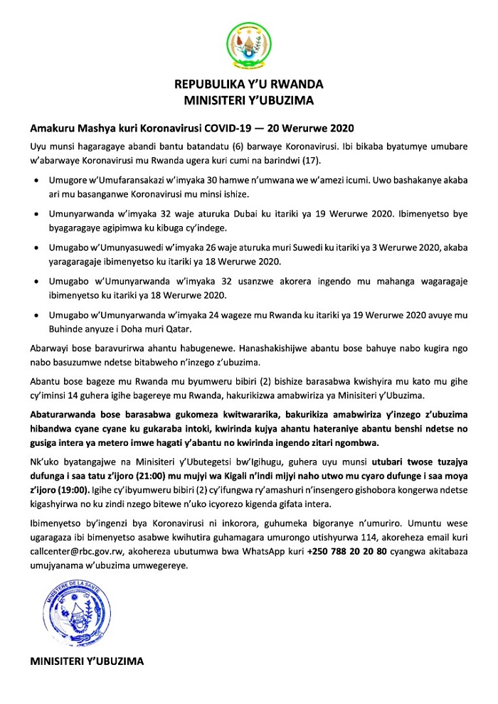 Minisiteri y’Ubuzima mu Rwanda yatangaje ko kuri uyu wa Gatanu tariki ya 20 Werurwe 2020 abarwayi ba COVID-19 bamaze kugaragara mu Rwanda ari 17, uyu mubare ukaba wazamuwe n’abarwayi batandatu bashya bagaragaye.