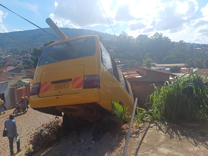Ati: “Kugeza ubu, abana bagejejwe kwa muganga ni 7 muri bo batatu ni bo ubona ko bakomeretse ku mutwe mu buryo bworoheje n’abarimu bari kumwe n’abana ntacyo babaye ndetse n’umushoferi nawe nta kibazo yagize uretse inzu yasenyutse n’iyo poto yangiritse”.
