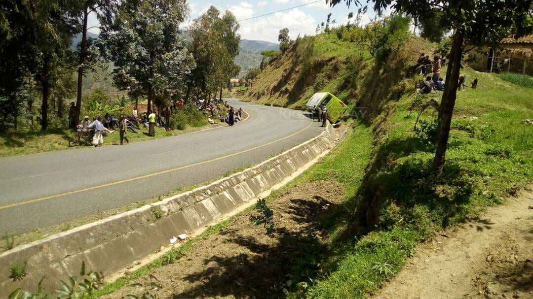 Iyo bisi ifite nimero za puraki RAD273K, yakoze impanuka igeze ahantu hari ikorosi, ita umuhanda yegama mu muferege uri ruguru y’umuhanda.