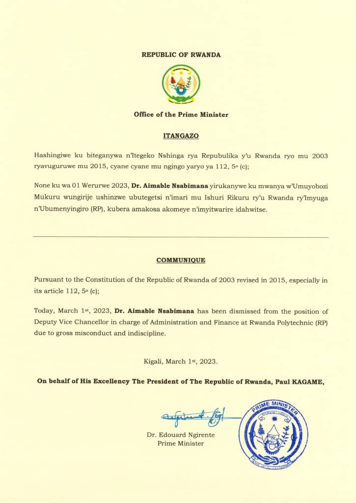 Ibiro bya Minisitiri w’Intebe bivuga ko azira amakosa akomeye n’imyitwarire idahwitse. Dr Nsabimana yari ari kuri uwo mwanya kuva mu kwa kabiri 2021.