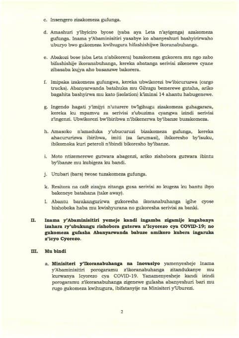 Iri tangazo rivuga ko imipaka izakomeza gufungwa, kereka ubwikorezi bw’ibicuruzwa (cargo trucks). Abanyarwanda batahuka mu gihugu bemerewe gutaha, ariko bagahita bashyirwa mu kato (isolation) k’iminsi 14 ahantu habugenewe.