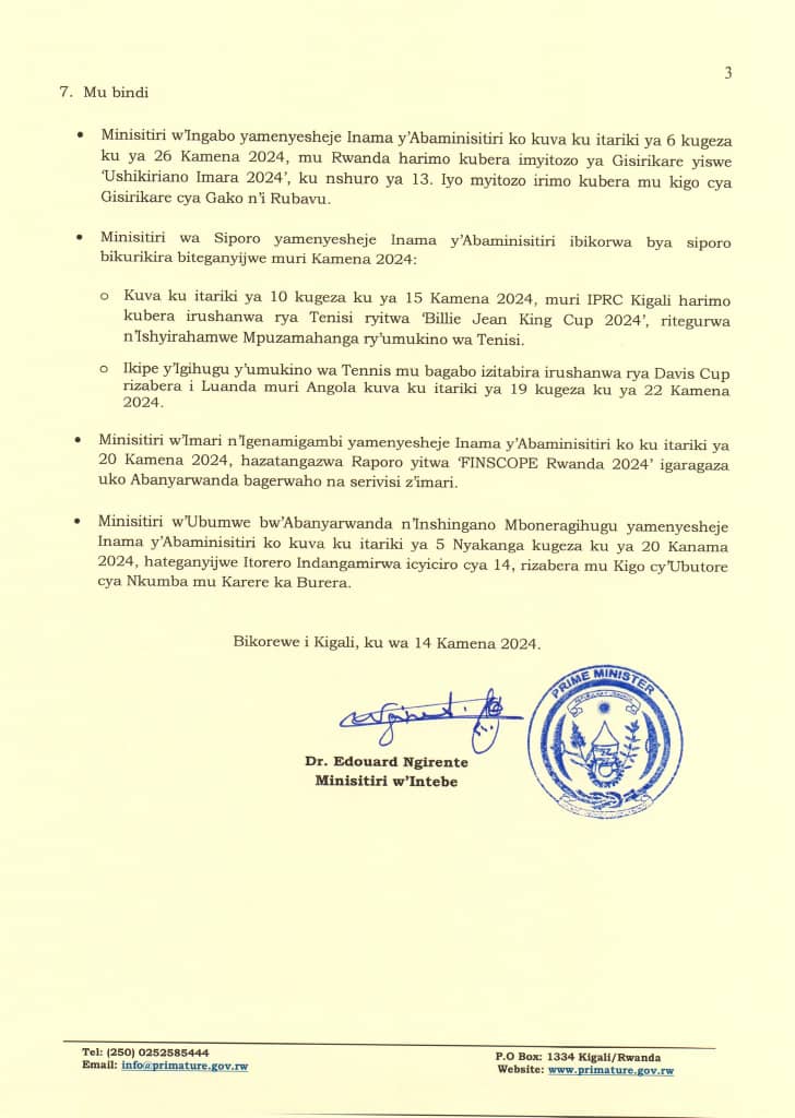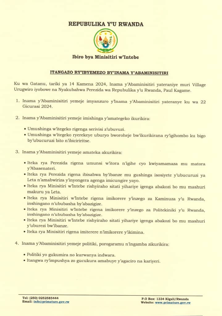 Ku mugoroba wo ku wa Gatanu tariki 14 Kamena 2024, Perezida Kagame yayoboye Inama y’Abaminisitiri yafatiwemo imyanzuro itandukanye, ndetse ishyira mu myanya bamwe mu bayobozi, abandi bahindurirwa iyo bari barimo.