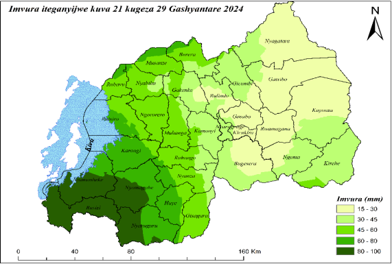 Imvura iri hagati ya milimetero 80 na 100 ni yo nyinshi iteganyijwe mu bice by’Akarere ka Rusizi, Amajyepfo y’Akarere ka Nyamasheke, Uburengerazuba bw’Akarere ka Nyaruguru na Nyamagabe. Imvura iri hagati ya milimetero 60 na 80 iteganyijwe mu bice bisigaye by’Akarere ka Nyamasheke, Karongi, Uburengerazuba bw’Akarere ka Huye na Nyanza, Amajyepfo y’Uburengerazuba bw’Akarere ka Rutsiro n’ibice biherereye muri Pariki y’Igihugu y’Ibirunga byo mu Karere ka Musanze, Burera, Nyabihu n’Amajyaruguru y’Uburasirazuba bw’Akarere ka Rubavu.