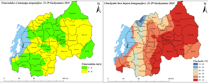 Meteo Rwanda iragira inama Abanyarwanda n’inzego bireba gukomeza ingamba zo gukumira no kwirinda ibiza. Amakarita akurikira aragaragaza birambuye ingano y’imvura, ubushyuhe n’umuvuduko w’umuyaga biteganyijwe muri buri karere.