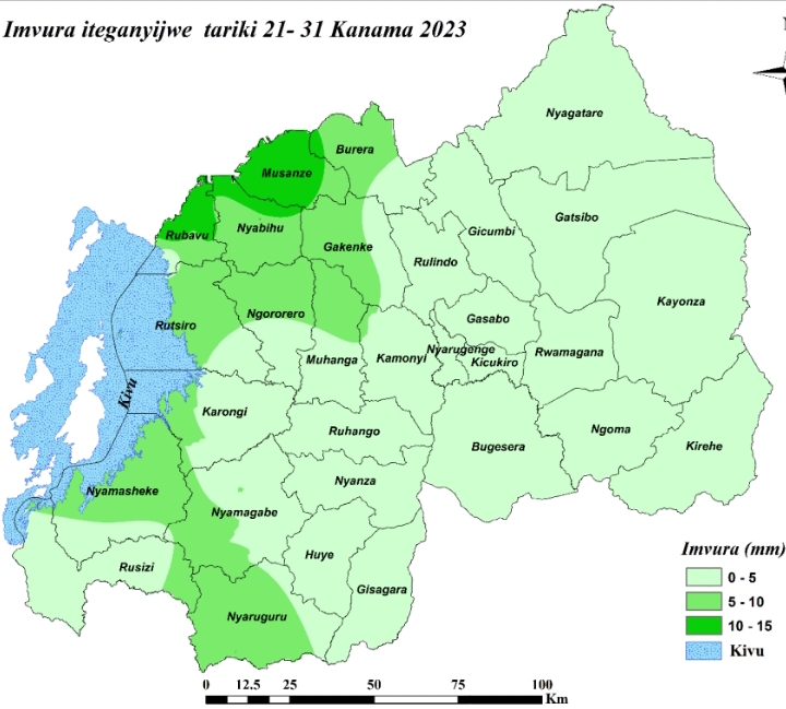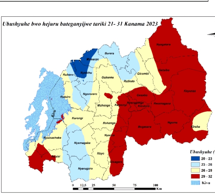 Iteganyagihe ry’iminsi 10 isoza uku kwezi kwa Kanama 2023 (kuva tariki 21-31), rigaragaza ko ahenshi mu Gihugu nta mvura izaboneka, ndetse ko hazabaho ubushyuhe bwinshi bugera kuri dogere Selisiyusi 32 (⁰C) i Kigali, Iburasirazuba, Amayaga n’i Bugarama(Rusizi).