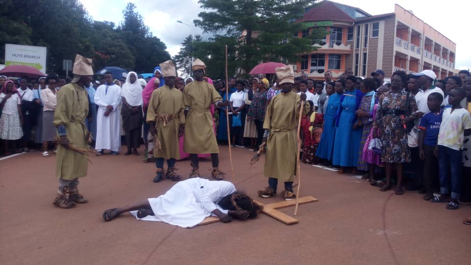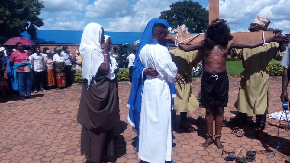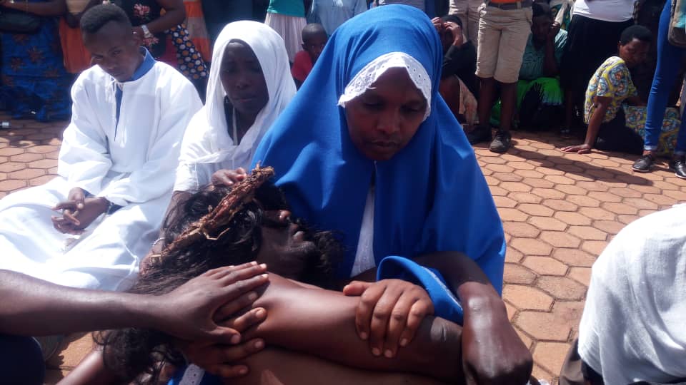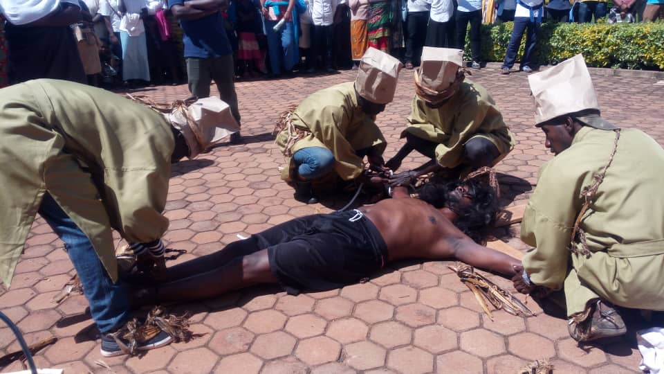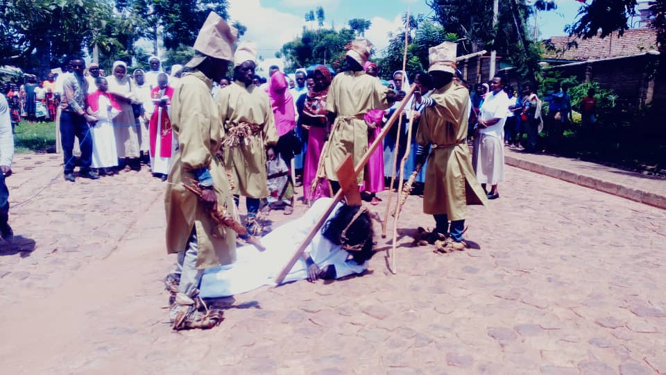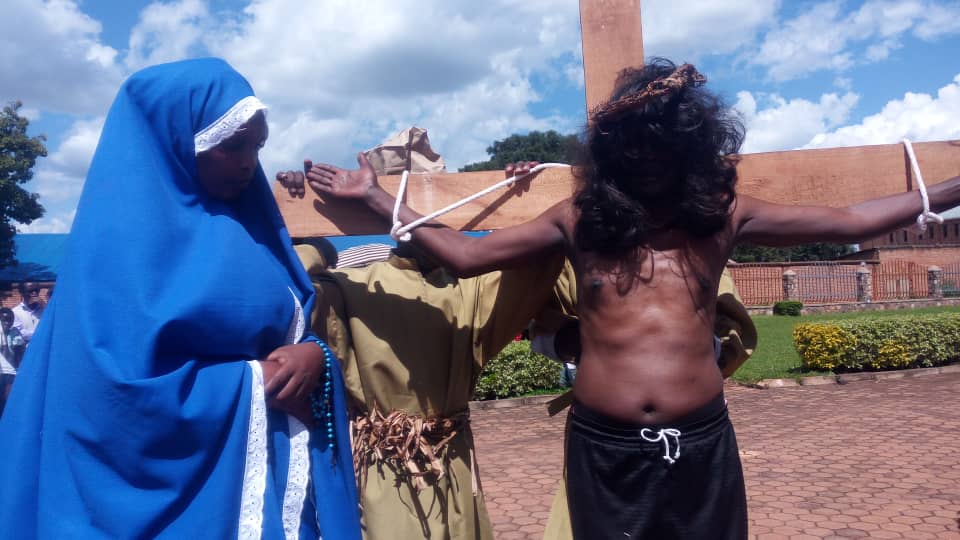 Aha kuri Katedarali uwakinaga Yezu yambuwe imyenda, abambwa ku musaraba, arapfa, maze aranashyingurwa.