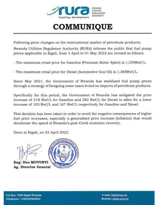 Minisiteri y’ibikorwa remezo iratangaza ko ibiciro by’ibikomoka kuri Peteroli byongeye kuzamuka, aho Mazutu itagomba kurenza 1,368Frw kuri litiro naho Lisansi ikaba 1,359Frw kuri litiro, bikaba bizatangira kubahirizwa guhera kuri uyu wa Mbere tariki 04 Mata 2022.
