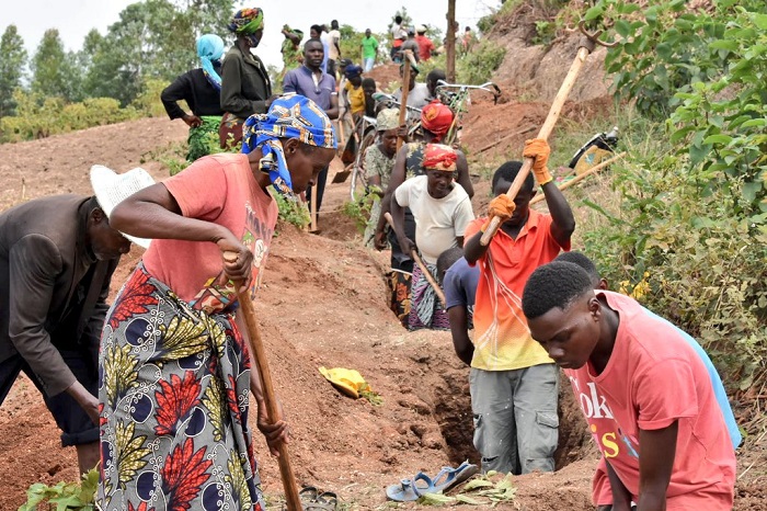 Mu Karere ka Kirehe abayobozi bafatanyije n’abaturage b’Umudugudu wa Rwamuzima, Akagari ka Butezi, Umurenge wa Gahara mu bikorwa byo gucukura no gusibura imirwanyasuri mu rwego rwo guhangana n’ingaruka z’imvura iteganyijwe mu minsi iri imbere.