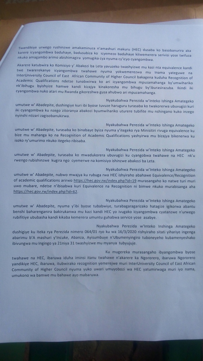 Leta yubumwe bw’abanyarwanda nifashe abo barimu n’anyeshuri bize muri Cavendish university Uganda bakore akazi kabo batekanye kuko icyangombwa bahawe na HEC kibemerera guhabwa service iyariyo yose mugihugu cy’Urwanda.