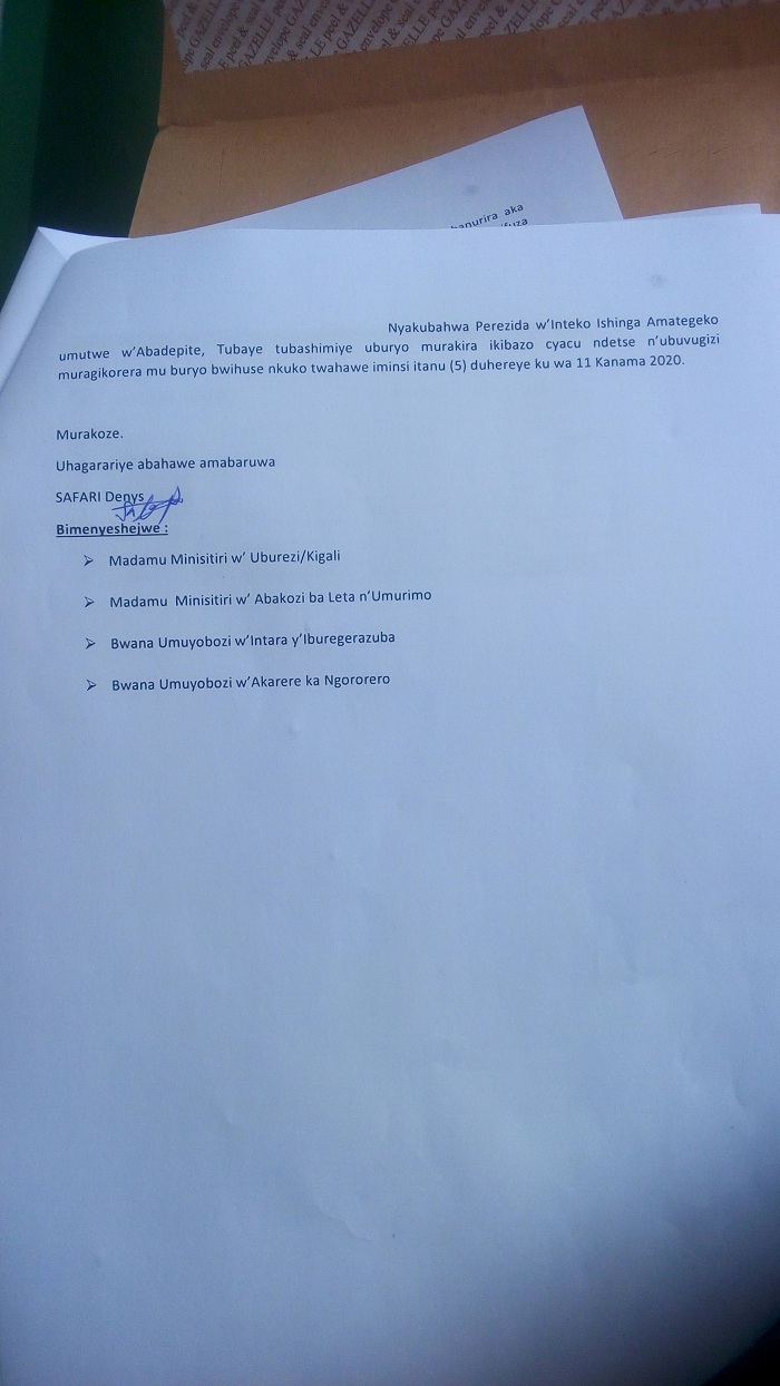 Abo barimu bandikiye Inteko Ishinga Amategeko umutwe w’Abadepite urwandiko rusobanura ikibazo cyabo, rukaba rwarakiriwe n’ushinzwe kwakira ibijyanye n’itumanaho anarushyiraho kashe igaragaza ko rwakiriwe, bikaba byarabaye ku wa Gatanu tari 21 Kanama 2020.